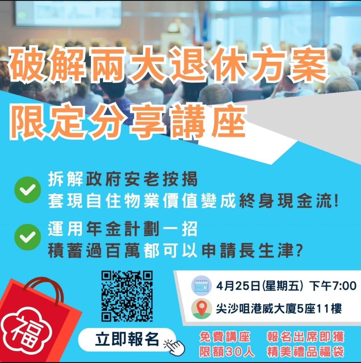 退休無憂從正確選擇開始!安老按揭🏠以物業換取終身收入,即時提升現金流;政府年金📈則提供穩定而可靠的定期回報,助你安心規劃未來。是次講座將透過真實案例🗂️、風險分析🚦及收益比較📊,深入剖析兩大方案,助你掌握核心差異,選擇最合適的理財策略,輕鬆享受退休生活🏖️✨!